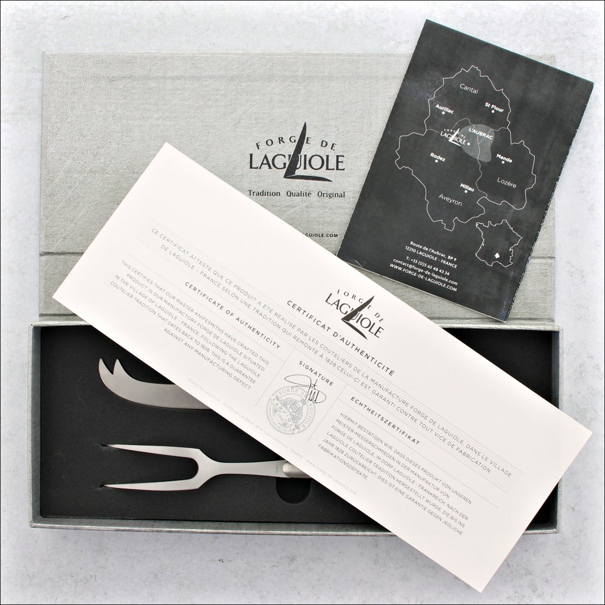Elevate your cheese experience with the Forge de Laguiole Tradition Cheese Set. This set features a versatile knife for precise slicing and a fork for easy serving. It's ideal for any cheese type and is available in five-handle material to match your table setting. This set is perfect for any occasion. Enjoy or gift the art of cheese with elegance and style.