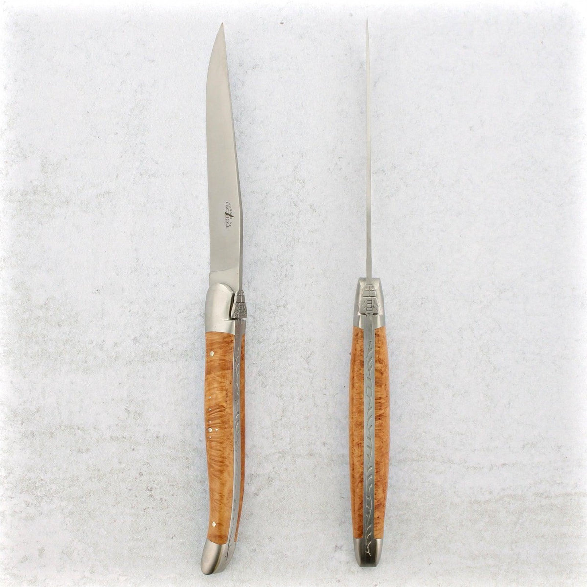 These Laguiole steak knives have a sleek brushed stainless steel finish. Additionally, they are also offered in mirror-polished finish here. You can discover more about metal finishes here if you still need to decide which one to pick.