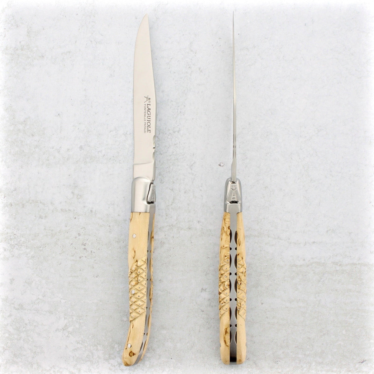 Studded Work: The intricate inlay work of stainless steel studs is completed by hand. This time-consuming process can only be carried out by Fontenille Pataud's most experienced artisans, making this beautiful diamond-shaped design an exceptional accomplishment. The knives are beautiful to look at and have a weight and feel that speaks volumes about the quality of artistry.