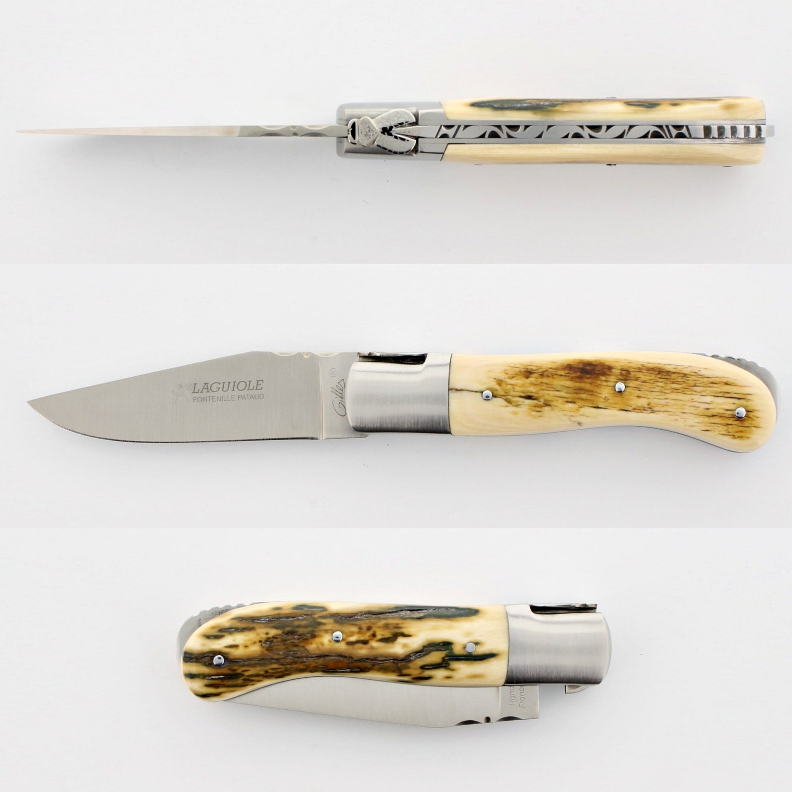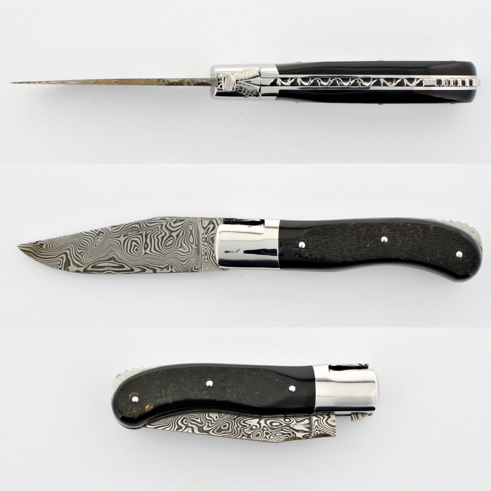 The Laguiole Gentleman Mammoth, Damascus steel, and mammoth tooth folding knives offer a compact yet powerful option for the dedicated outdoors enthusiast. Its design features a shorter blade paired with a longer handle, delivering the perfect balance of portability and functionality. This "stubby" knife fits comfortably in your pocket and adds a touch of elegance to your outdoor gear. Crafted by hand, this exquisite pocket knife includes a precision lock-back mechanism for enhanced safety. Equipped with a Teflon washer, the blade opens and closes easily, ensuring a smooth and secure operation every time.