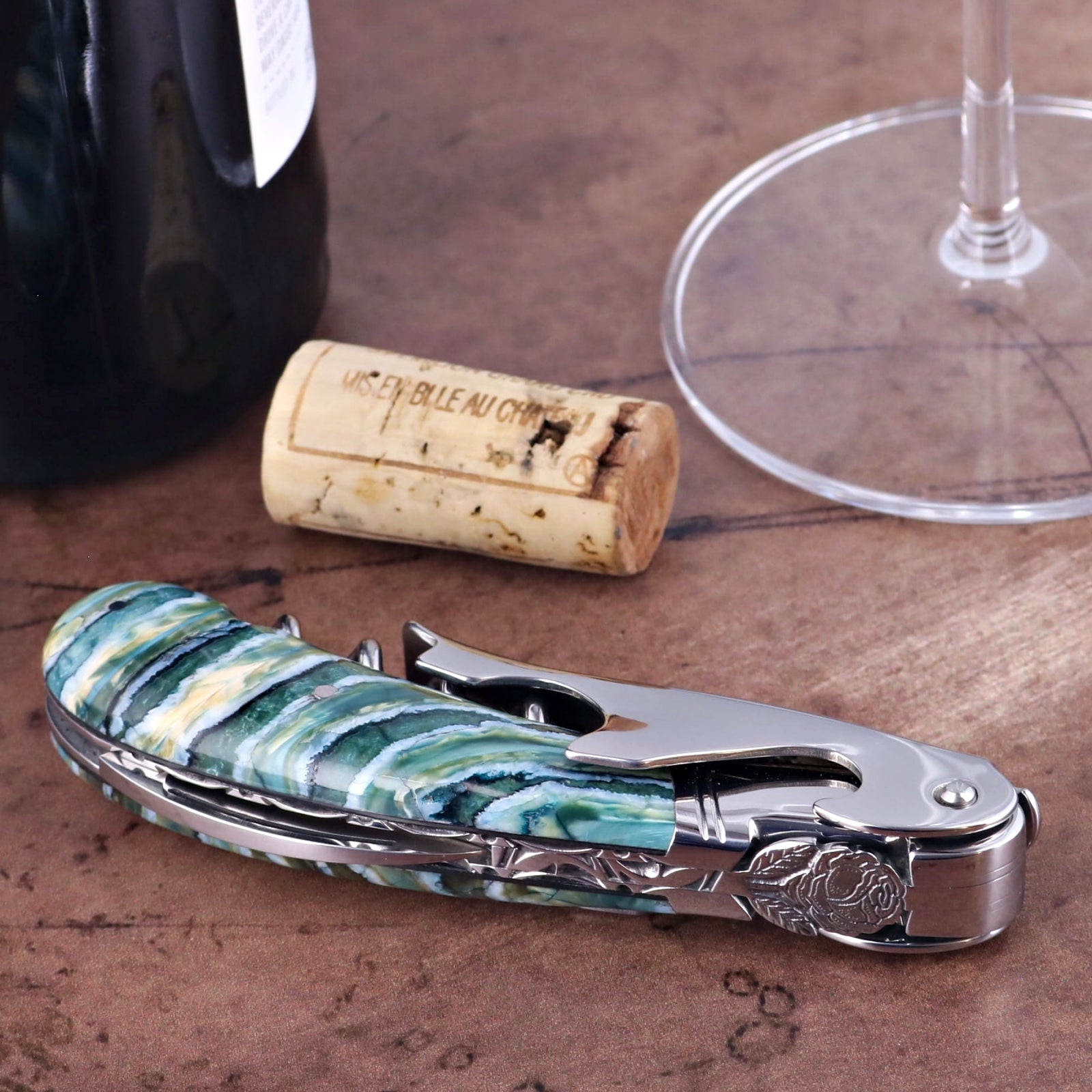 These Laguiole Magnum's handles are made of 10,000+ years old fossilized mammoth molar teeth harvested in Siberia. The molar is stabilized for strength and dyed in various colors, some of which are pretty stunning. Note that only one color is used to create a handle; the color variance within a handle is caused by the ability of certain areas of the tooth (i.e., enamel) to absorb the single-color dye. Fossilized molar is a tough material because of its enamel layers; diamond-cutting tools must be used to cut it in many cases.
