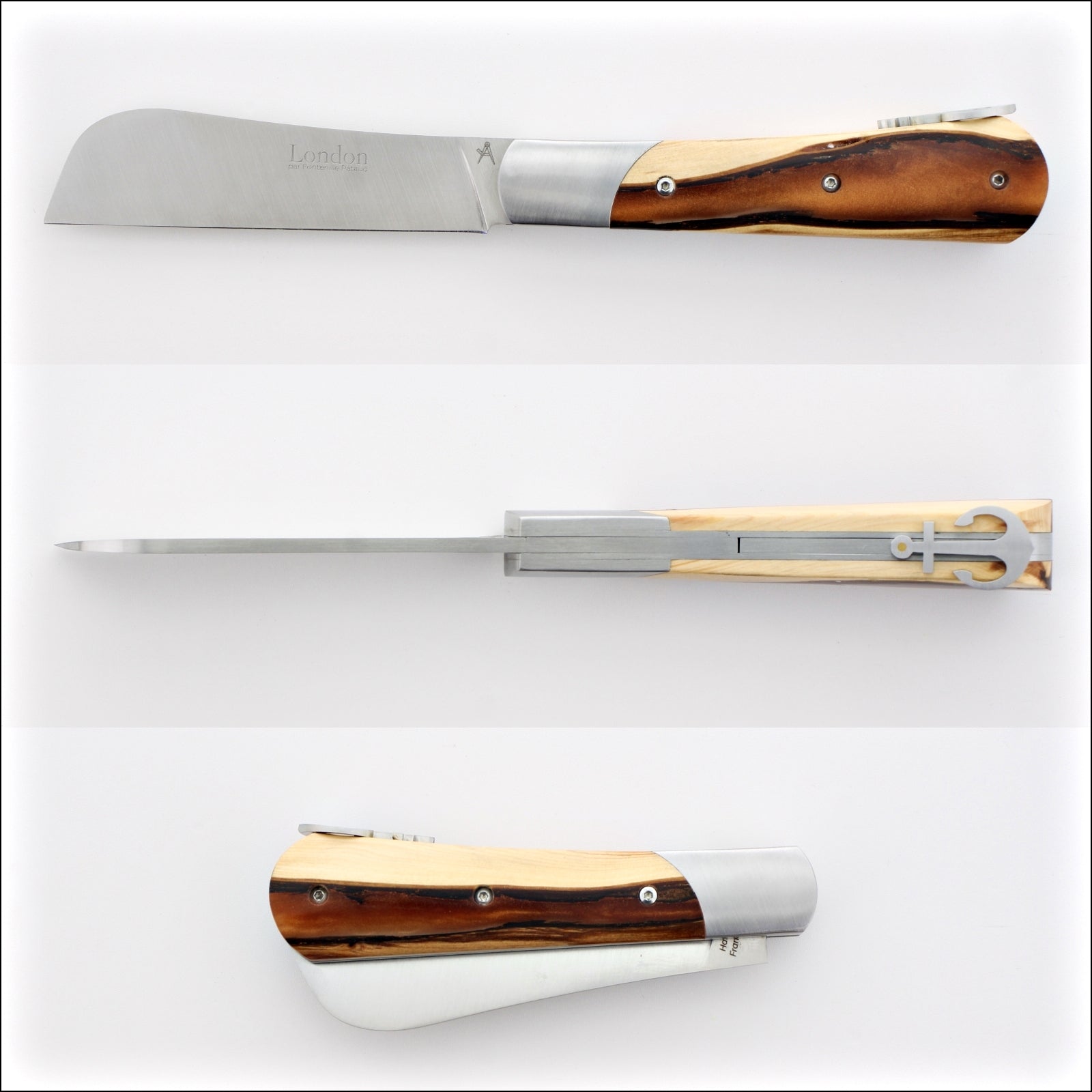 Drawing from its nautical heritage, the extended version of the knife, measuring 22 cm (8.66") when opened, was historically the sailor's tool for slicing through ropes. The blade's distinctive non-pointed shape was purposefully designed to prevent accidental injuries aboard a ship's heaving deck, while its flat, cleaver-like form ensured precise, clean cuts.