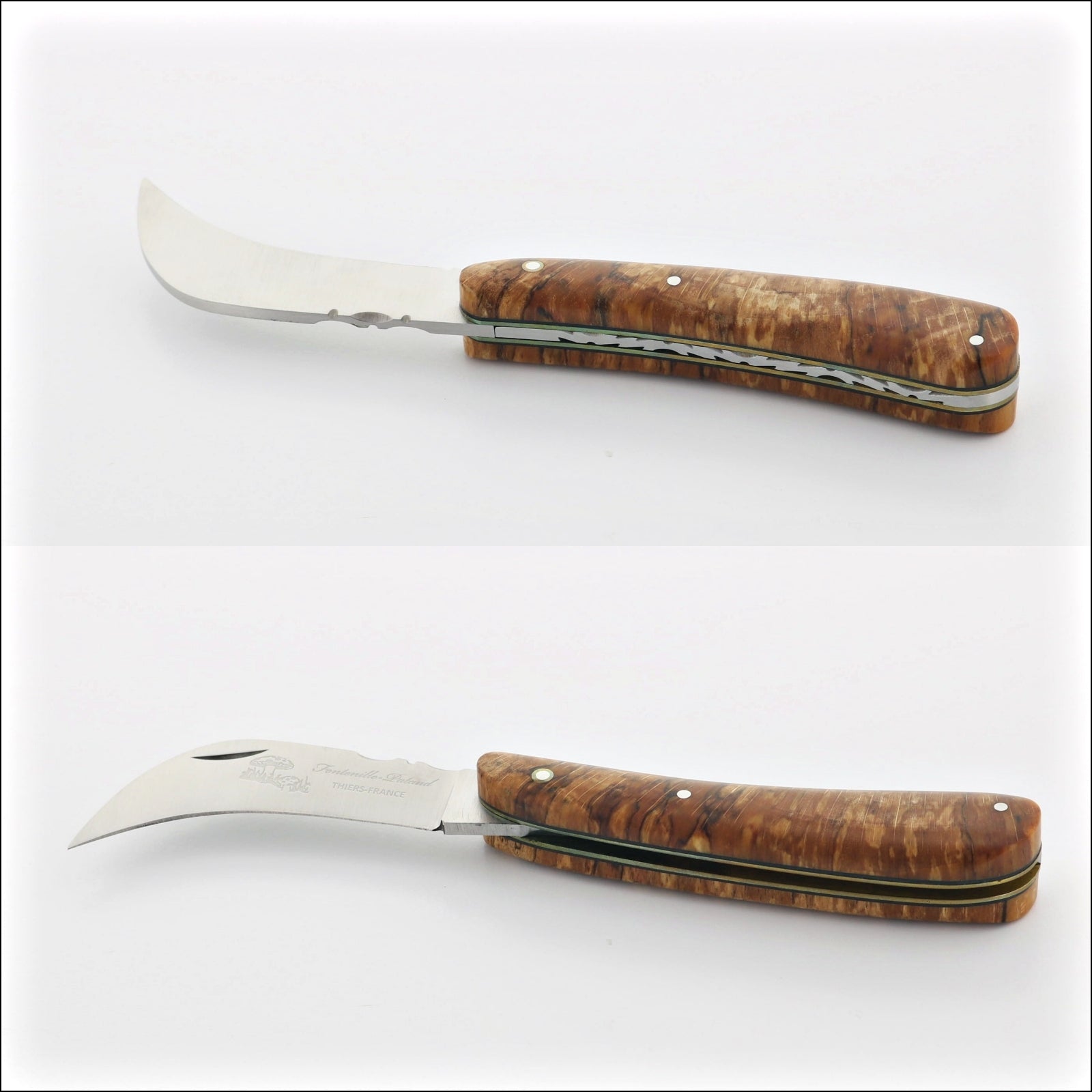 The Mushroom-Garden Knives in this collection were specifically created for mushroom picking, but they also excel as a garden and pruning tool. Unlike traditional knives, it has no bolsters, making it lightweight and nimble. The curved blade allows for a rocking motion, making it effortless to cut through stems, branches, and other plant matter. This design is especially useful when harvesting fruits and vegetables. Overall, its curved shape offers superior cutting performance, versatility, control, and less strain, making it a top pick among gardeners and foragers.