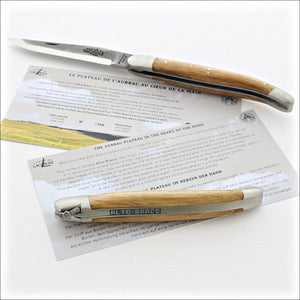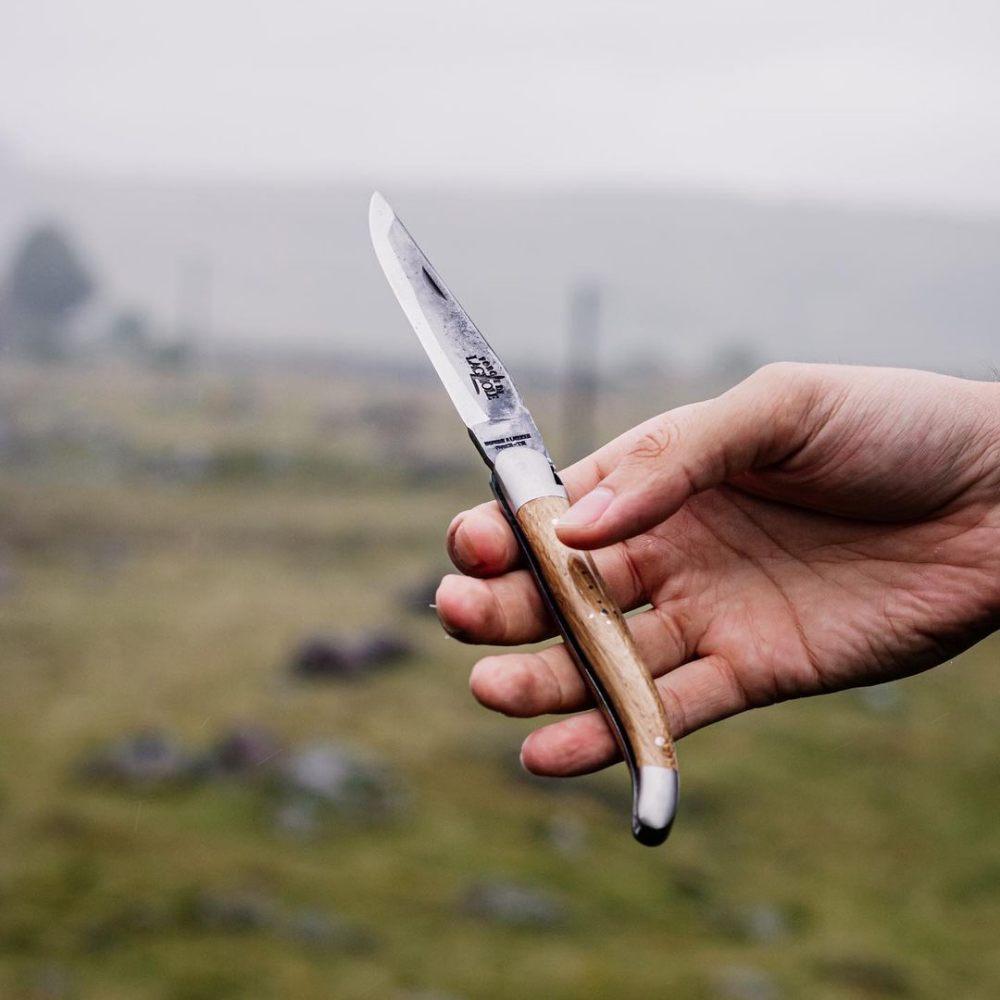 The handle of this limited edition folding knife is made from an Oak beam recovered during the renovation of a centuries-old "Buron" (a Shepherd's Hut) located on the Aubrac's high plateau in Aveyron, France. It is believed that such structures (usually impossible to date) can easily be over 200 years old, making the actual oak used during the original construction at least 3 to 4 hundred years old.