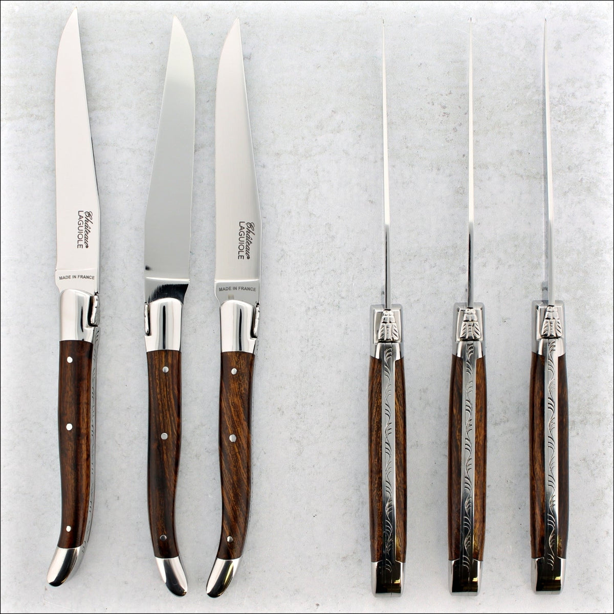 The Heritage series Laguiole steak knives are meticulously crafted to honor the timeless elegance of traditional Laguiole cutlery. Handmade in the esteemed French shop, they share the same origin as the famed Chateau Laguiole corkscrews.