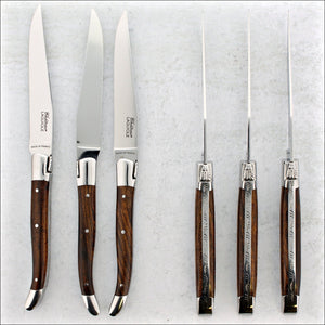 Laguiole steak knives have become a popular choice for elegant dining due to their high quality and distinctive design. These knives were first crafted in the early 19th century in the French village of Laguiole, from which they got their name. They are known for their unique features, including a slender, tapered blade and a curved, ergonomic handle, which provide excellent functionality and comfort during use.Desert Ironwood (Olneya tesota) - One of the world hardest wood and most difficult to work with due to its density.
