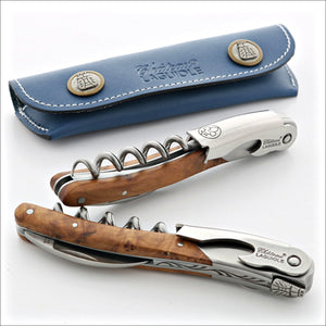 All Versailles series corkscrews are adorned with a Fleur de Lys. Traditionally, this symbol has been used to represent French royalty, and in that sense, it is said to signify perfection, light, and life. Additionally, this series is presented with a blue leather sheath. Bleu de France (Blue of France) is a color traditionally used to represent France. Blue has been used in the French monarchy since the early 12th century.