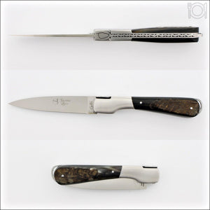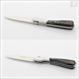 Introducing another exquisite addition to Fontenille Pataud's Corsican series: a highly ergonomic folding knife. Unlike the Rondanira knife, this model showcases a modified single-edge spear point blade. However, please note that it is not meant for throwing purposes. With its considerable length, this knife serves as an excellent choice for daily use at the dining table. It's important to note that this is not a split-joint knife, and the blade cannot be folded unless the lock-back mechanism is pressed firmly.