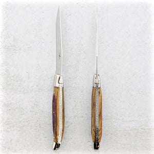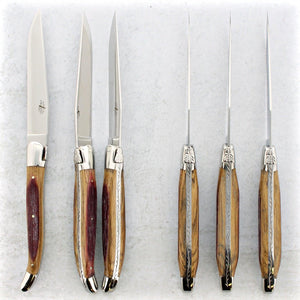 Forge de Laguiole table steak knives are manufactured in the village of Laguiole and feature the iconic bumblebee and the traditional shepherd's cross on most models. Forge de Laguiole represents the pinnacle of quality in the Laguiole cutlery business. Their reputation for integrity, ethics, and innovative designs has made these small 100 employees company the "Must Have" Laguiole luxury brand.