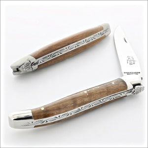 Gunstock burled walnut harvested in France. Please note that the actual handle color and pattern of the item you receive may vary from the stock photos.
