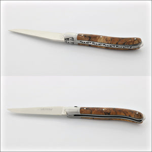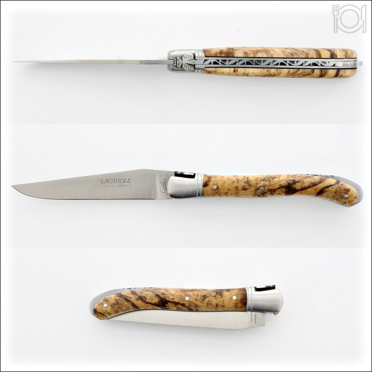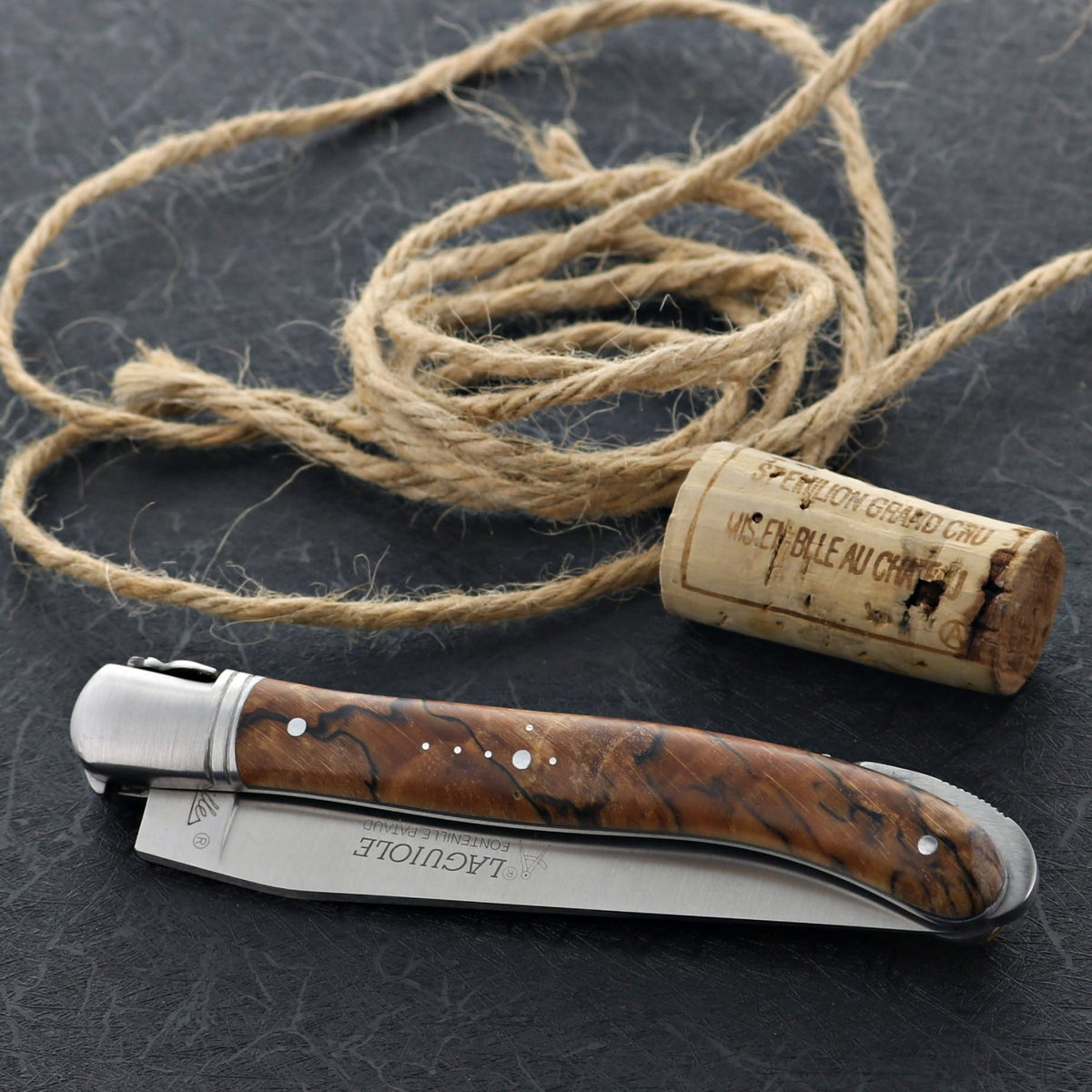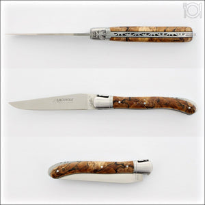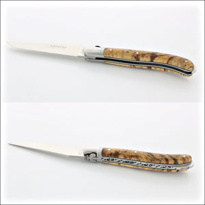 The Laguiole Nature Pocket Knife is the epitome of French craftsmanship. By integrating a Teflon-assisted lock-back system and solid blade stop, this piece of art has ascended into one of our top picks. It's worth noting that the size of this knife also makes it an excellent choice for a folding steak knife.