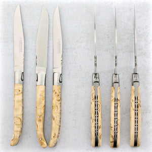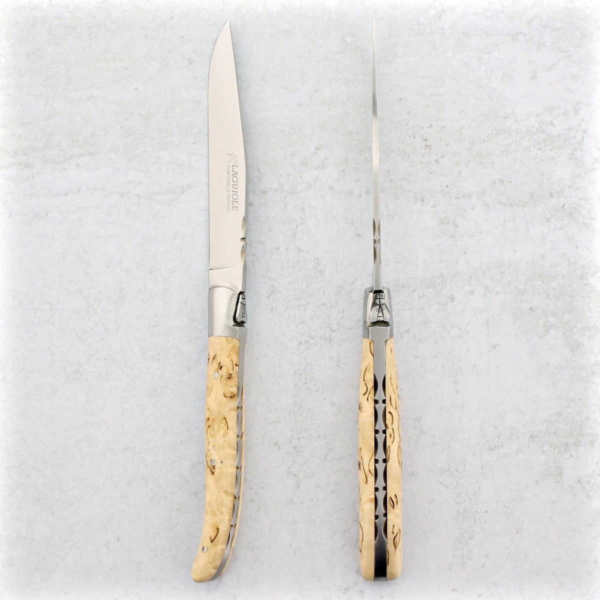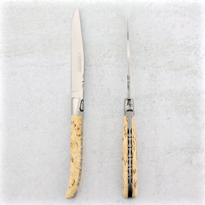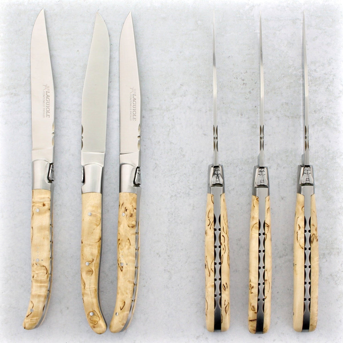 A single cold forged metal rod of Z40C13 Stainless steel is used to make each steak knife, giving them a unique quality among all other Laguiole table knives on today's market. Each knife top is hand filled with intricate designs. The knives are beautiful to look at and have a weight and feel that speaks volumes about the quality of artistry.