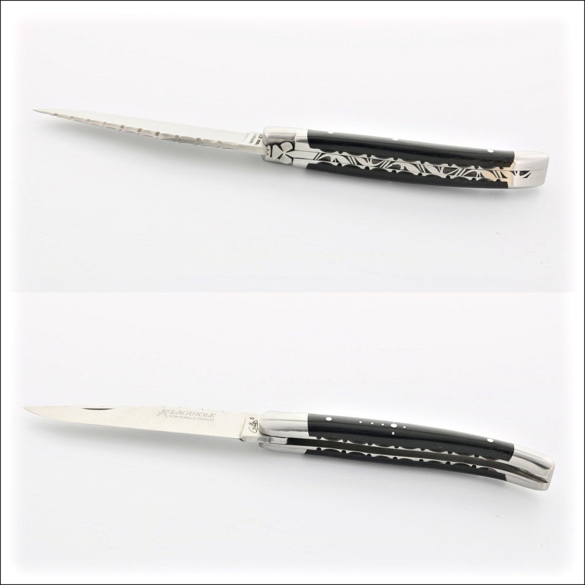 The file work on the springs (top of handle) are individually hand filled by a French artisan, therefore all are different. Additionally, two handles made from the same material can have very different patterns.