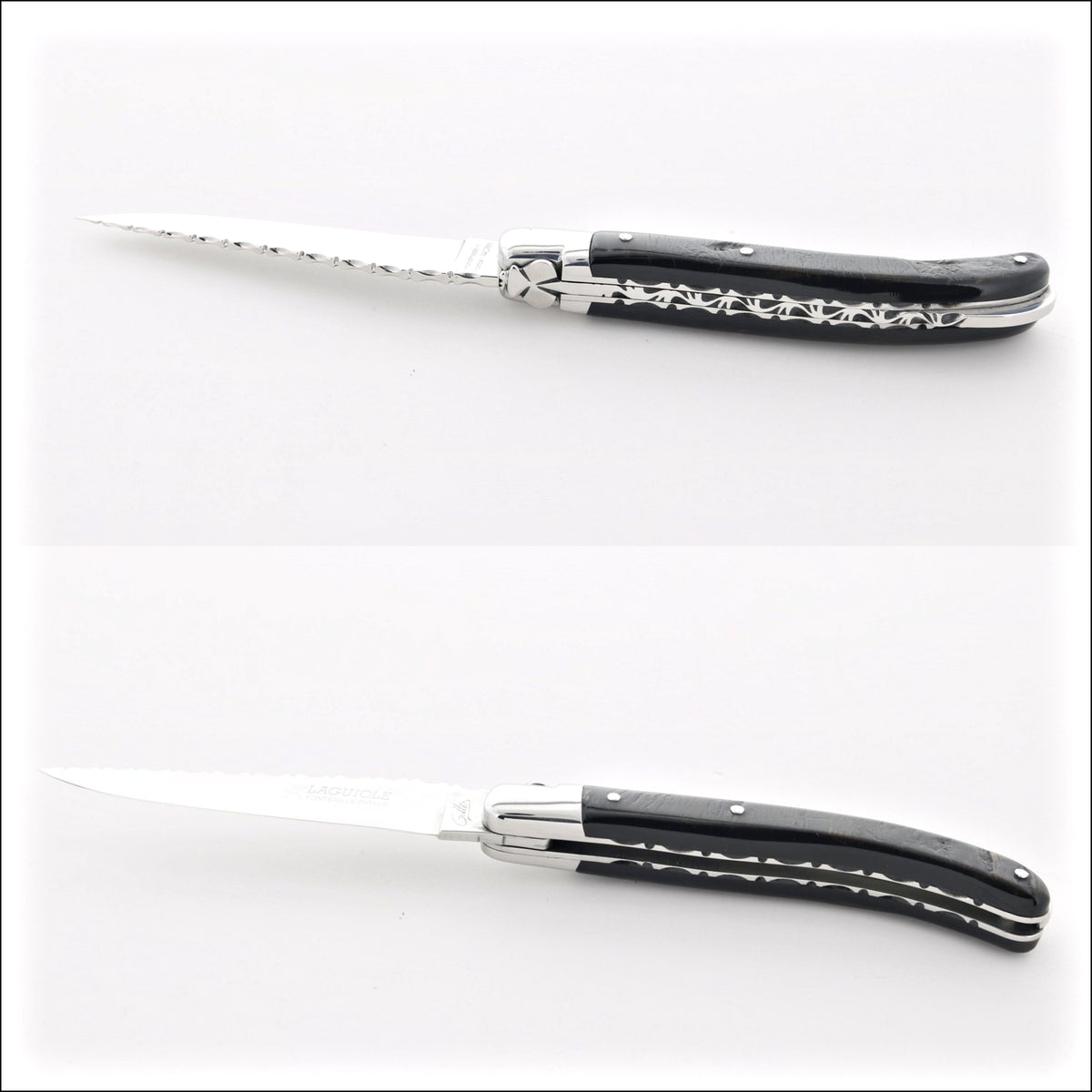 The file work on the springs (top of handle) are individually hand filled by a French artisan, therefore all are different. Additionally, two handles made from the same material can have very different patterns.