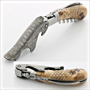 A bold version of the legendary Laguiole corkscrew has finally arrived to revolutionize the world of wine accessories. With its sleek patented one-piece two-step boot lever and elegant forged spring & bee design - exquisitely sculpted in one unique and steady piece – this sophisticated waiter's tool makes opening any regular or Magnum bottle effortless! It also has a non-serrated foil cutter for added sharpness and ease of sharpening.