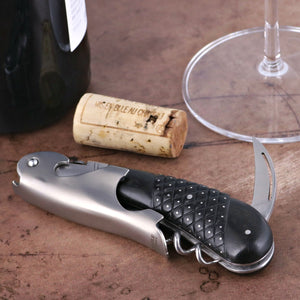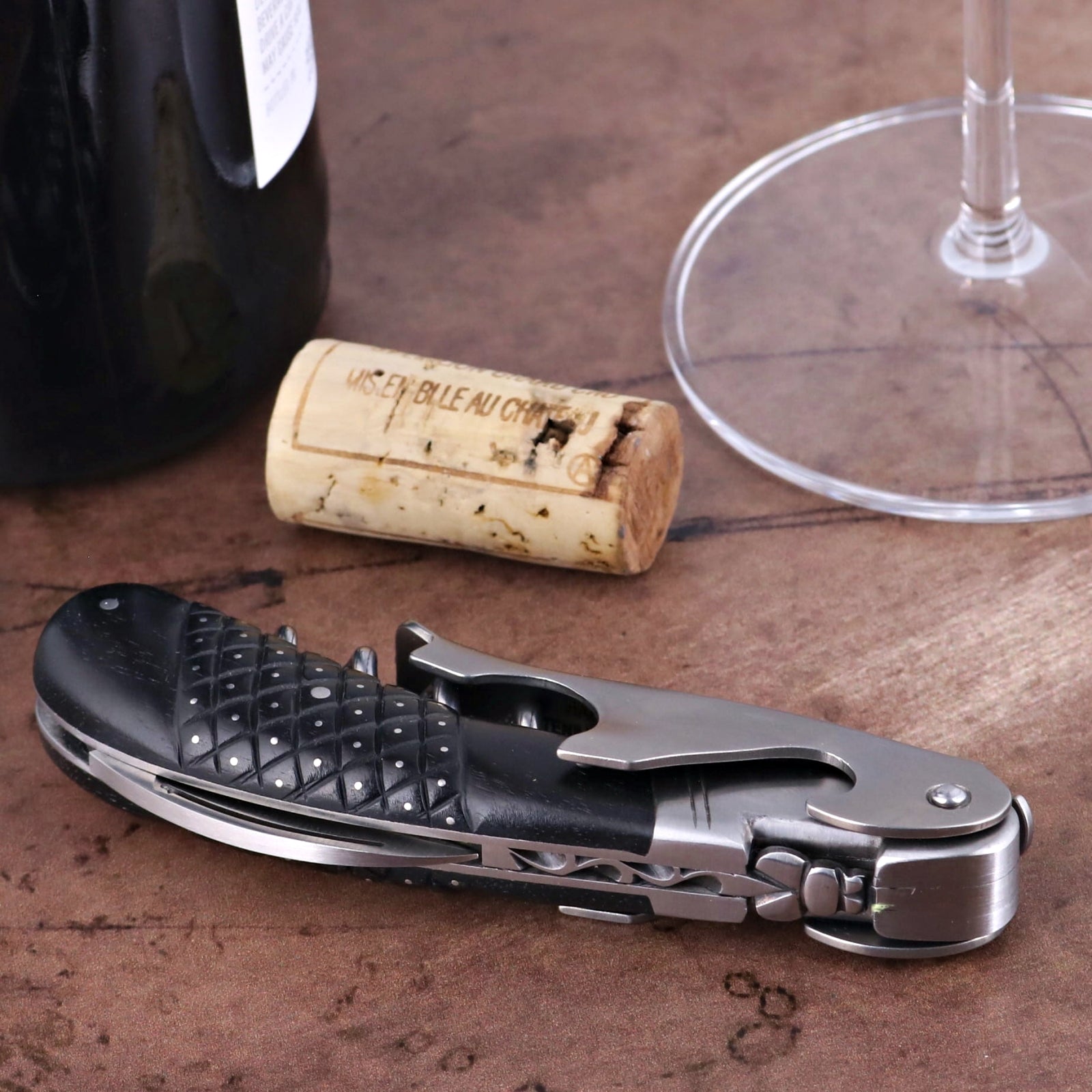 A bold version of the legendary Laguiole corkscrew has finally arrived to revolutionize the world of wine accessories. With its sleek patented one-piece two-step boot lever and elegant forged spring & bee design - exquisitely sculpted in one unique and steady piece – this sophisticated waiter's tool makes opening any regular or Magnum bottle effortless! It also has a non-serrated foil cutter for added sharpness and ease of sharpening.