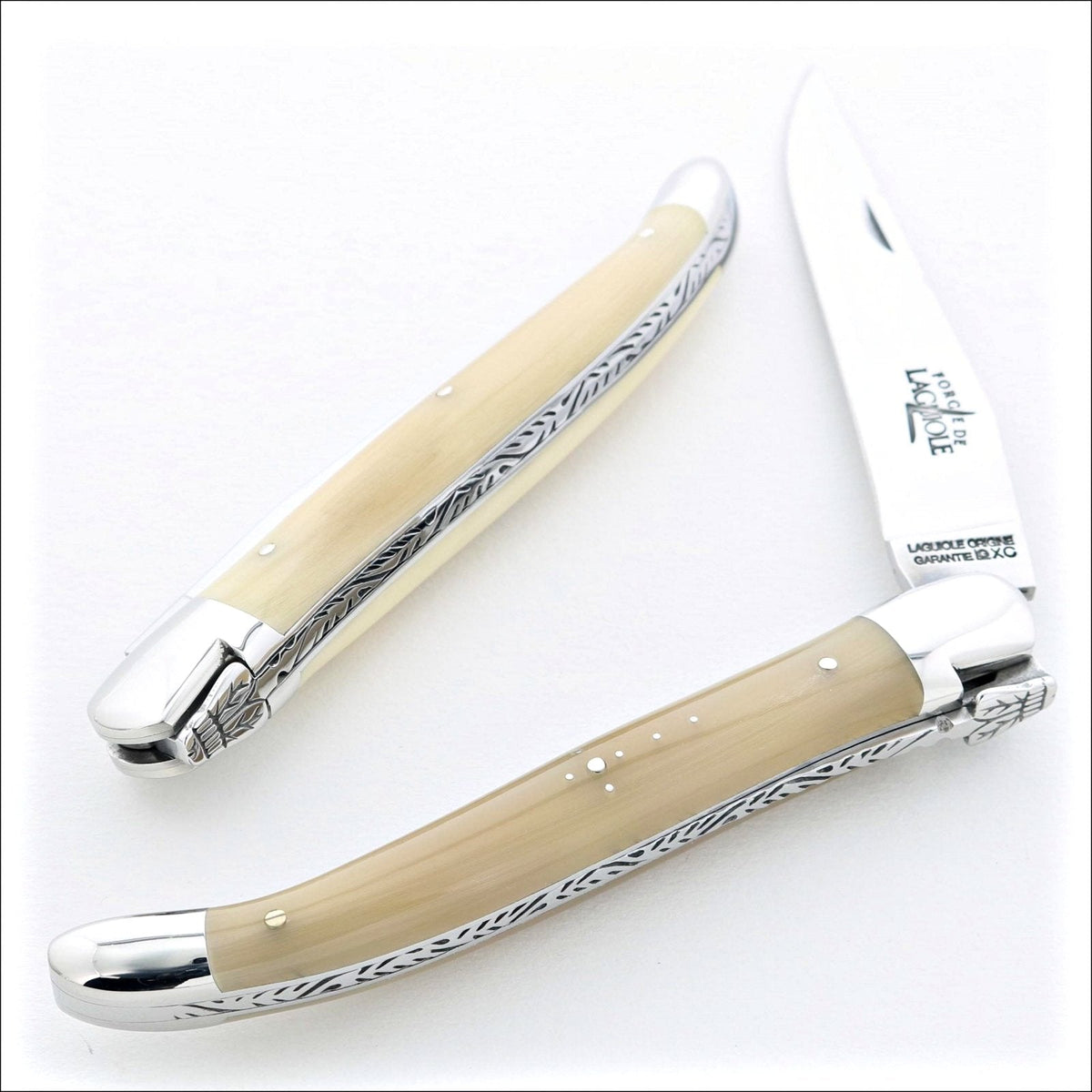 A 12 cm Laguiole folding knife can be used as a steak knife; its open length is 8. 3/4" vs. ~9" for a standard steak knife. Why use such a knife at the dinner table or at your favorite steak house? Check out our article (new tab) for the surprising answer.