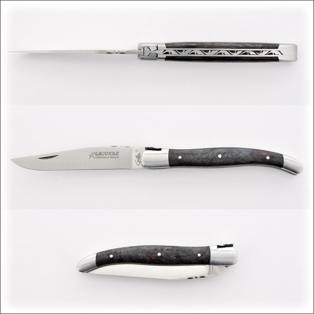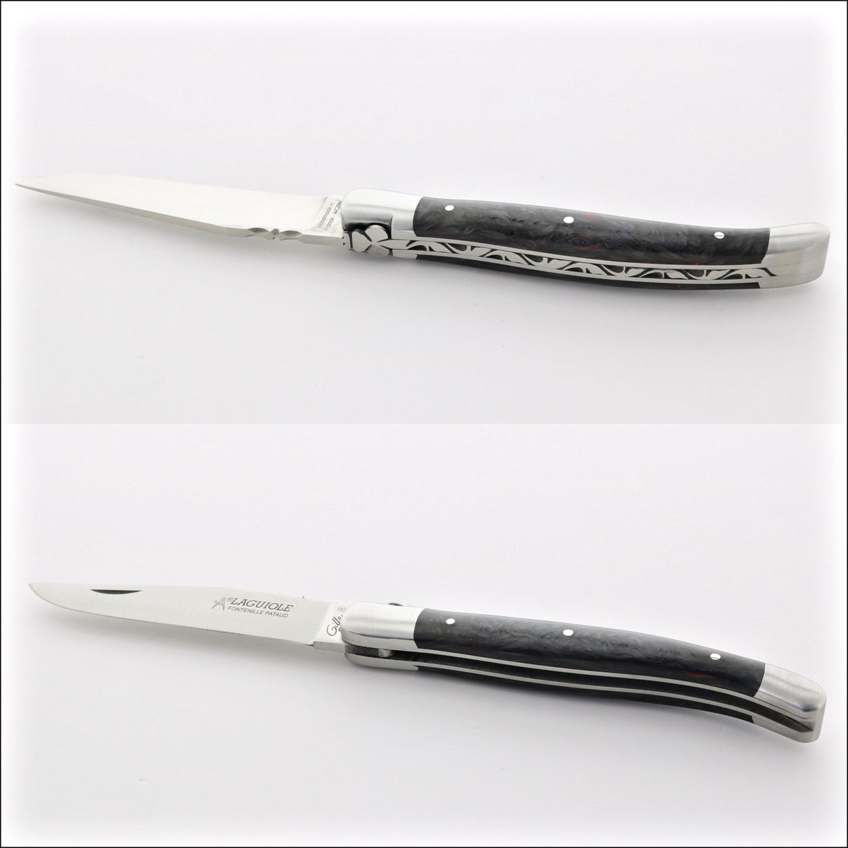 The file work on the springs (top of handle) are individually hand filled by a French artisan, therefore all are different. Additionally, two handles made from the same material can have very different patterns.