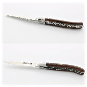 This elegantly designed pen knife combines compactness with a precision lock-back mechanism, ensuring a secure blade lock. With its small size, the Laguiole XS 9 cm (3.5 inches when closed) is perfect for a gentleman's suit pocket or a lady's handbag. The bee and spring of this knife are fabricated from a single piece of stainless steel, showcasing intricate craftsmanship. Along with the spring file work, the liners, and blade's top are also exquisitely chiseled.