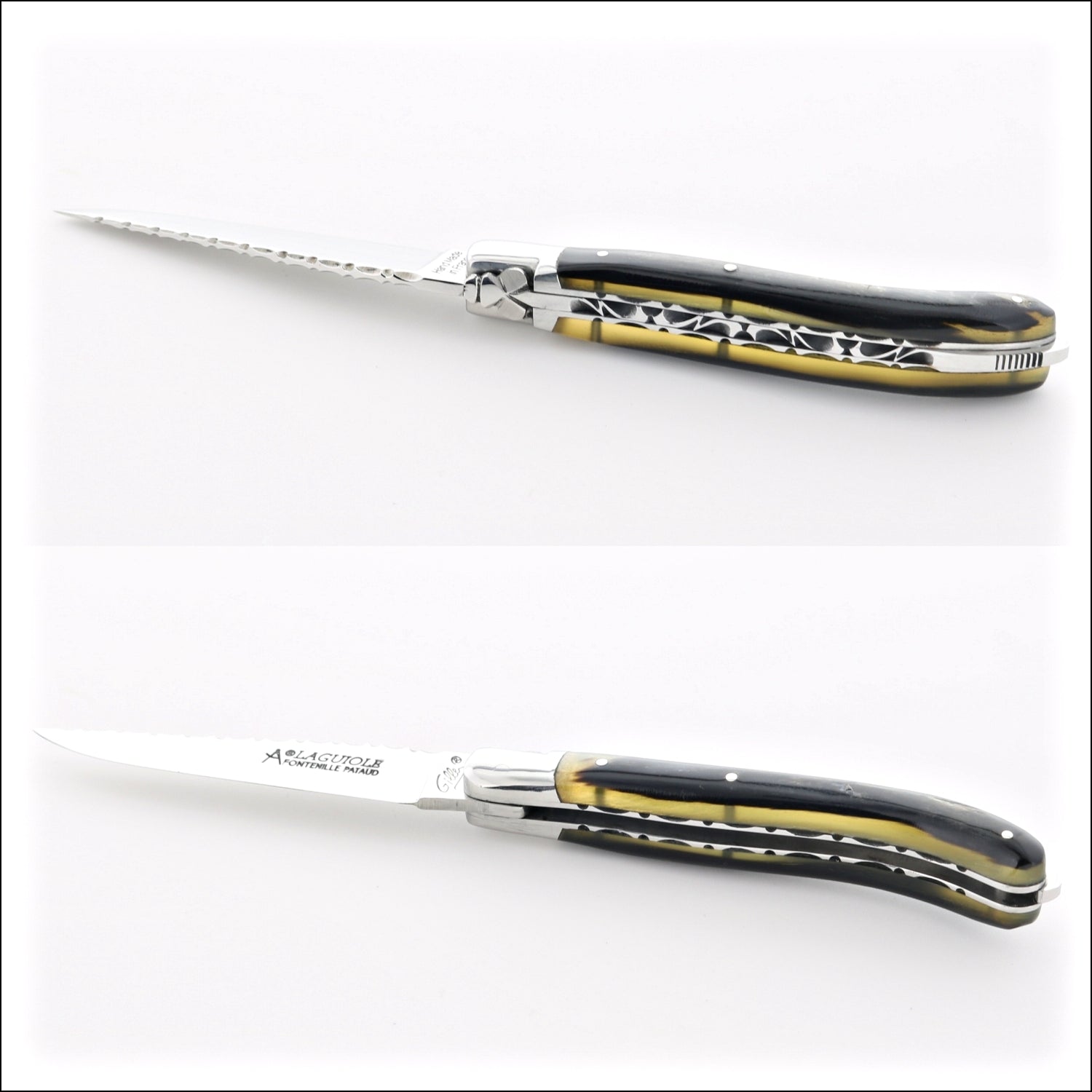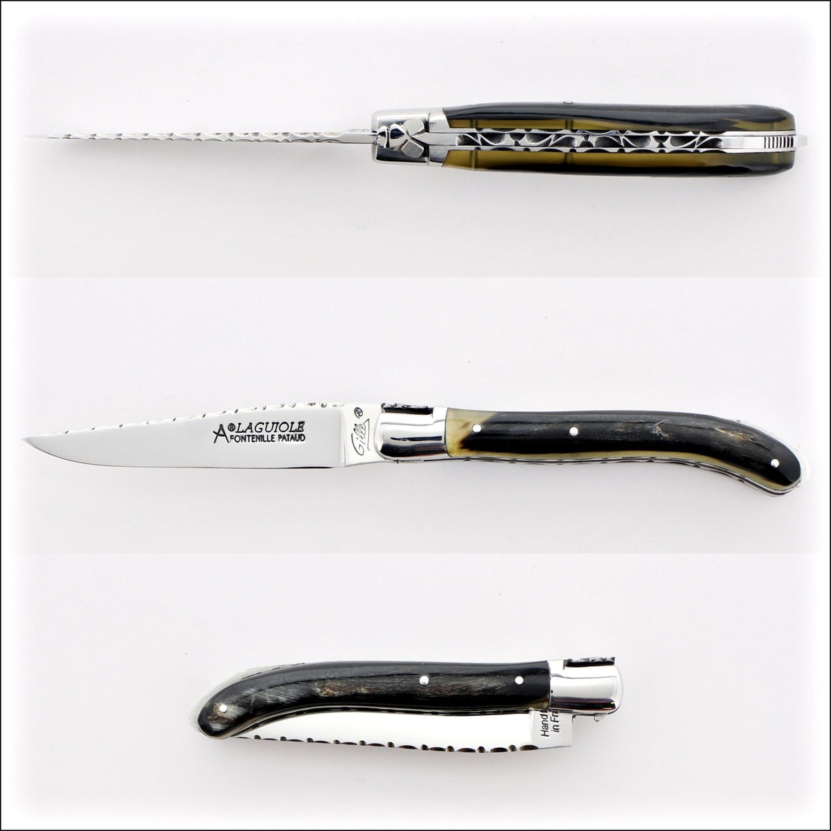 The file work on the springs (top of handle) are individually hand filled by a French artisan, therefore all are different. Additionally, two handles made from the same material can have very different patterns.