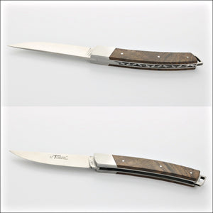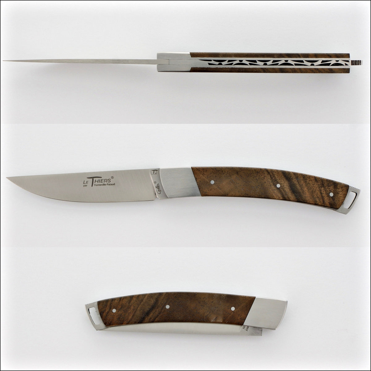 Handcrafted in Thiers-France, this knife was approved by the "Coute de Tie," the Guild which certifies the authenticity of the design. The name Le Thiers® Nature by Fontenille Pataud” is a tribute to the city of Thiers. Like Solingen in Germany or Sheffield in England, Thiers has, for several centuries, been the hub of the French knives and cutlery industry. Le Thiers® Nature by Fontenille Pataud offers a good balance between the blade and the handle thanks to its special forged spring. A groove into the back of the spring allows the blade to fold in.