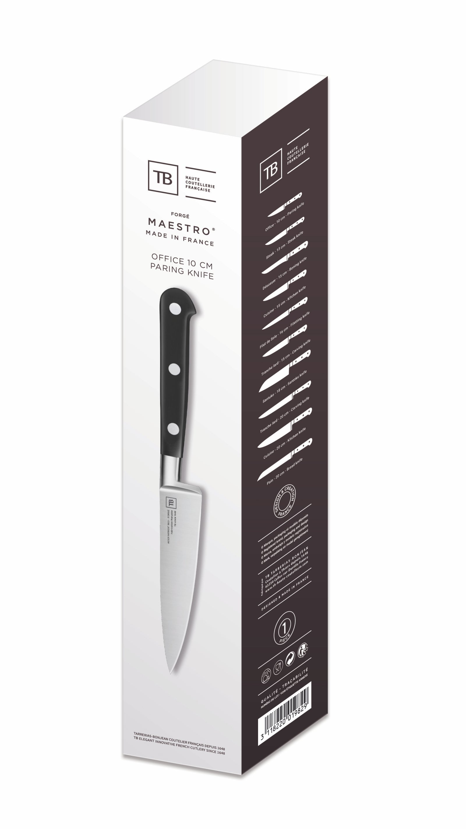 Discover the Maestro IDEAL paring knife, meticulously crafted in Thiers by renowned French cutler Tarrerias-Bonjean, mostly known as "TB." This knife features a 10 cm (3:5") NICROX steel blade, offering the versatility you expect from a high-quality paring knife.