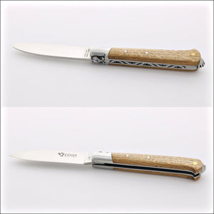 Named after the village of Yssingeaux (translation from local dialect = five cockerels), this knife honors the Gallic Rooster, the unofficial national bird of France. With his rooster crest look-back mechanism and Teflon washers, this charismatic knife's blade action operates smoothly and safely during opening and closing.