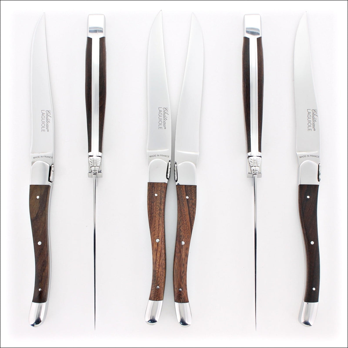 Crafted with a perfect fusion of the traditional curves of a Laguiole knife and the distinctive style of the Chateau Laguiole® corkscrew, these masterfully crafted steak knives are true masterpieces. Combining minimalist elegance with a comfortable square handle, they stand out from other Laguiole designs.