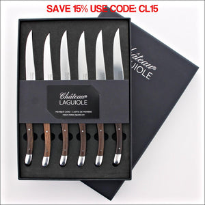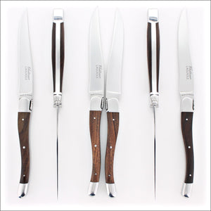 Laguiole steak knives are popular at the dinner table due to their elegant design and high quality. These knives are named after the French village of Laguiole, where they were first crafted in the early 19th century. They are known for their distinctive shape, typically including a slender, tapered blade and a curved, ergonomic handle.This cutlery set is not dishwasher safe.