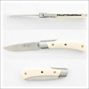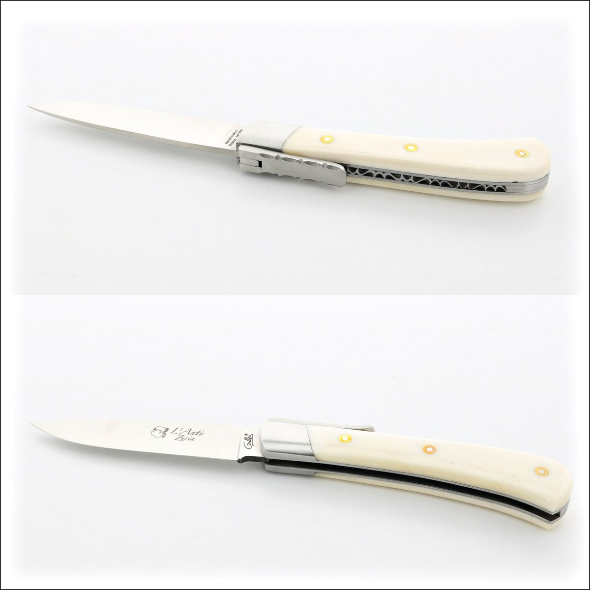 Corsican L' Antò Classic pocket knife by Fontenille Pataud. This EDC features a clever locking blade system located on top of the handle. Easy and comfortable to use, each user will find his or her own way to trigger it. This Corsican knife like all others offered by Fontenille Pataud was created in collaboration with the Zuria family of Bonifacio Corsica.