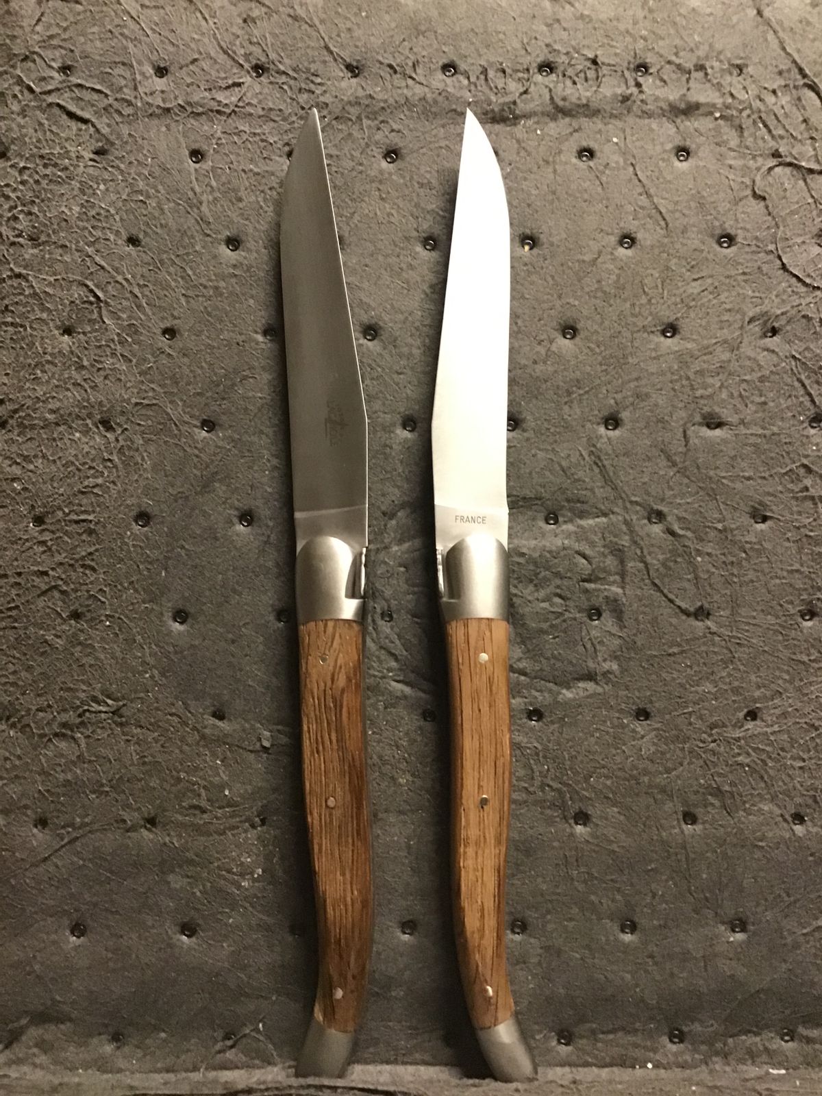 These Laguiole steak knives have a sleek brushed stainless steel finish. Additionally, they are also offered in mirror-polished finish hereYou can discover more about metal finishes here if you still need to decide which one to pick.