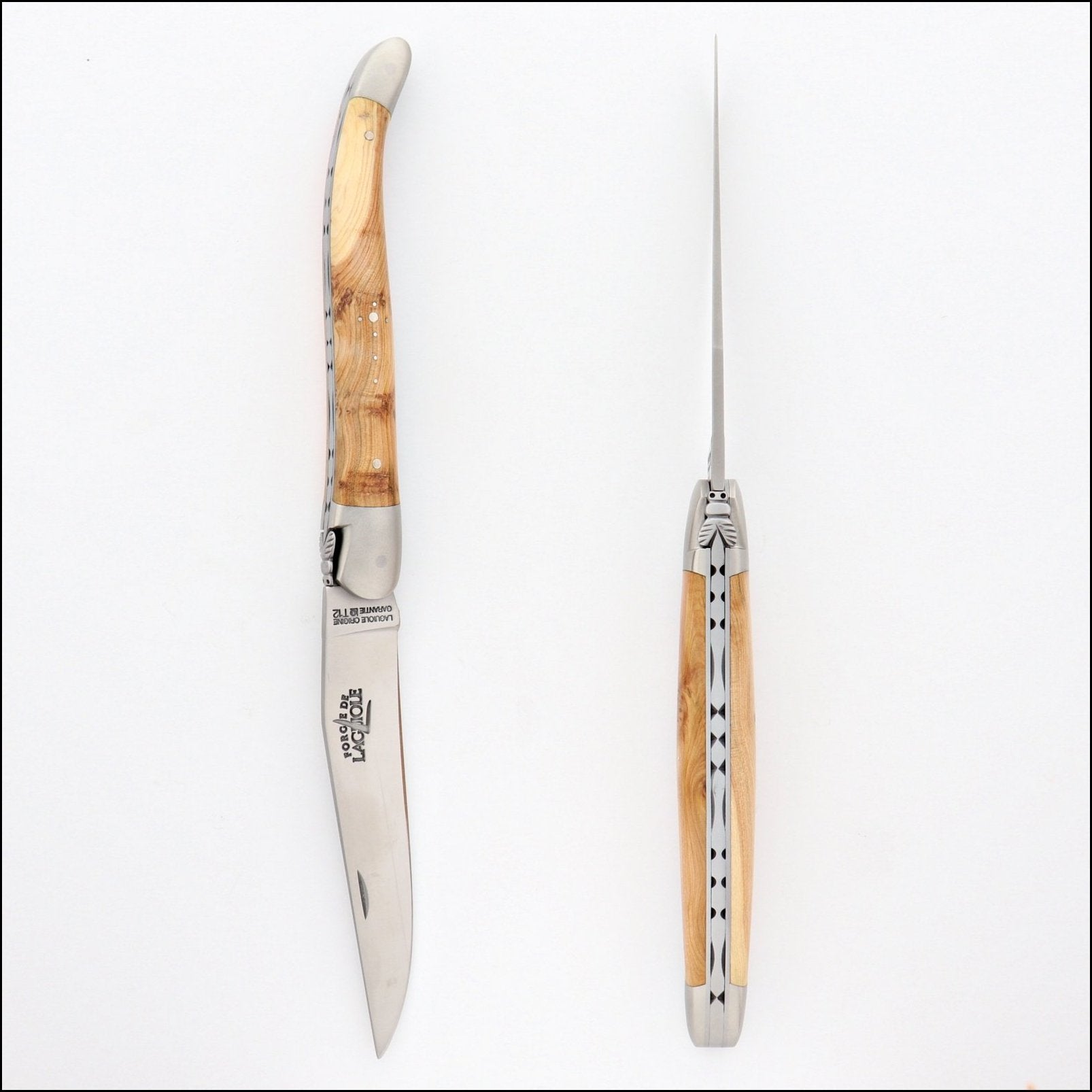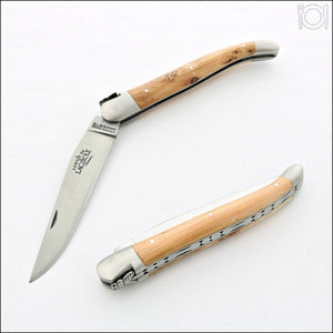 This particular knife was made in the village of Laguiole and is equipped with a forged bee and forged in-house blade. The handle is adorned with the traditional Laguiole shepherd's cross on the left side.