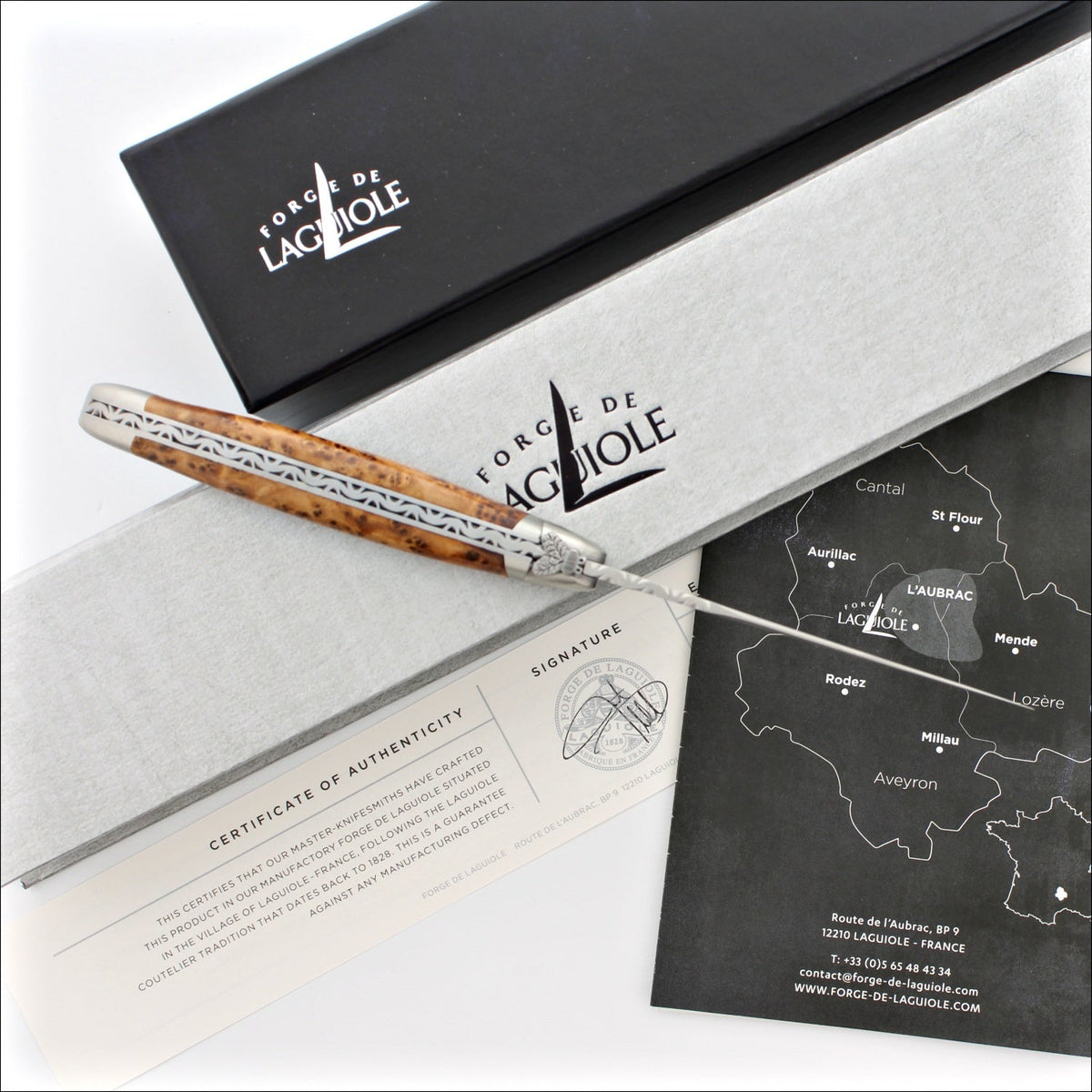 Handmade in the village of Laguiole, France, Forge de Laguiole knives are truly and by far of the highest quality offered in the market today. Additionally, each masterpiece is entirely handmade by the same craftsman to ensure pride in the completed piece.