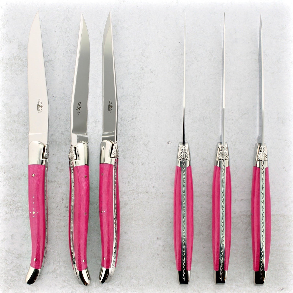 a set of 6 forge de Laguiole 6 Piece Steak Knife Set Opalescence handle on a dark grey wood background