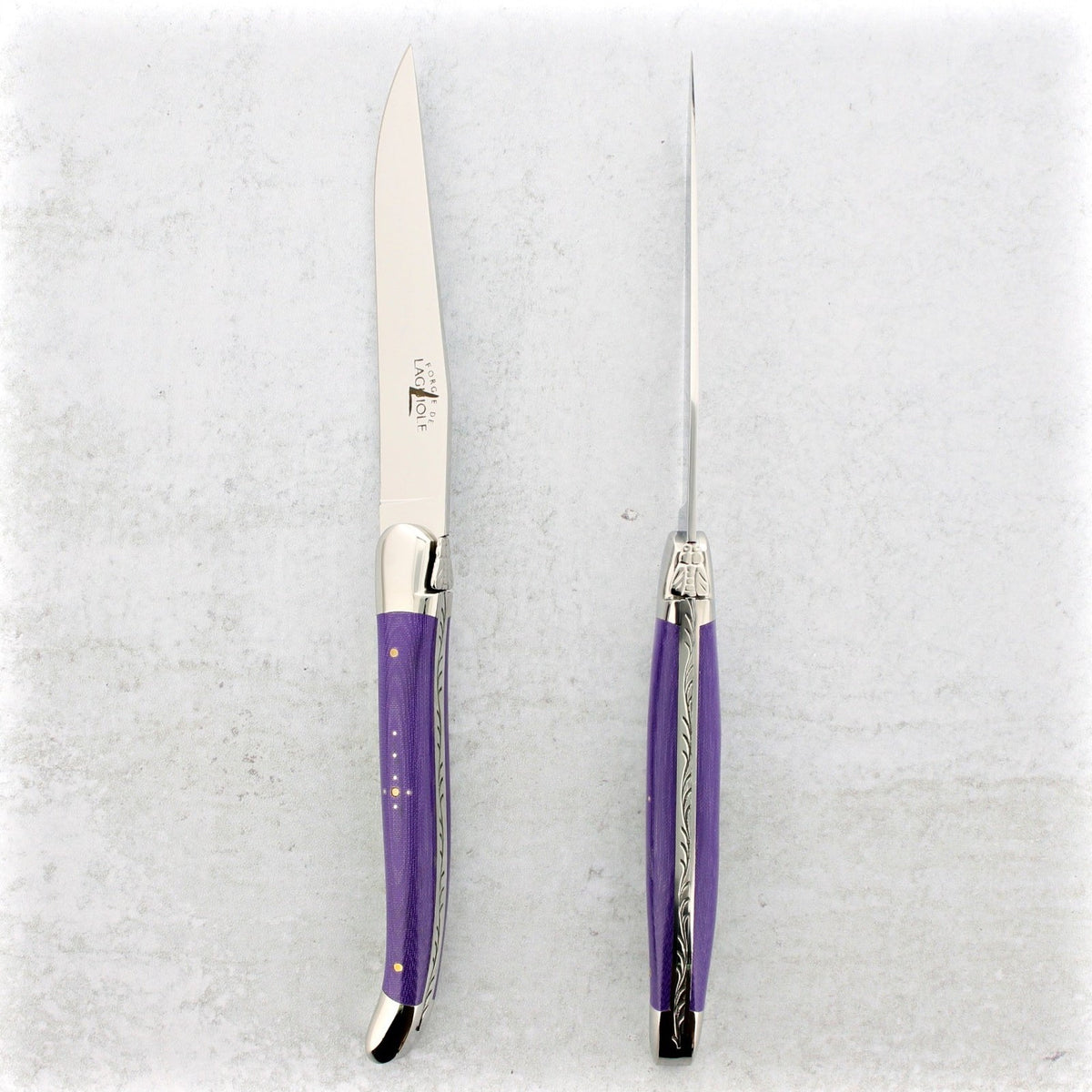 With their iconic Laguiole curved design, these knives are elegant and ergonomic. They combine the heftiness of weight with unsurpassed sharpness to make cutting a breeze!