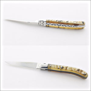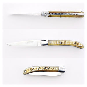 This sleek pocket knife features a precise lock-back mechanism for secure blade locking during use. Teflon washers ensure smooth and safe operation while opening and closing the blade. The one-piece forged spring and "Bee" add to its elegance. With a 10.5 cm (4.10") handle, this compact Laguiole folding knife tackles everyday tasks with style and sophistication.