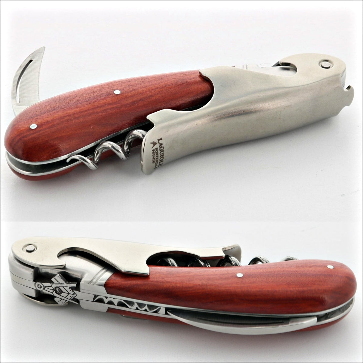 A bold version of the legendary Laguiole corkscrew has finally arrived to revolutionize the world of wine accessories. With its sleek patented one-piece two-step boot lever and elegant forged spring & bee design - exquisitely sculpted in one unique and steady piece – this sophisticated waiter's tool makes opening any regular or Magnum bottle effortless! It also has a non-serrated foil cutter for added sharpness and ease of sharpening.