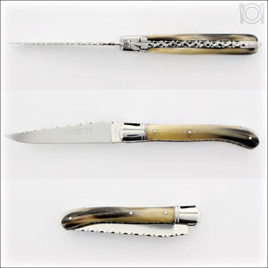 A 12 cm Laguiole folding knife can be used as a steak knife; its open length is 8. 3/4" vs. ~9" for a standard steak knife. Why use such a knife at the dinner table or your favorite steak house? Check out our article (new tab) for the surprising answer.