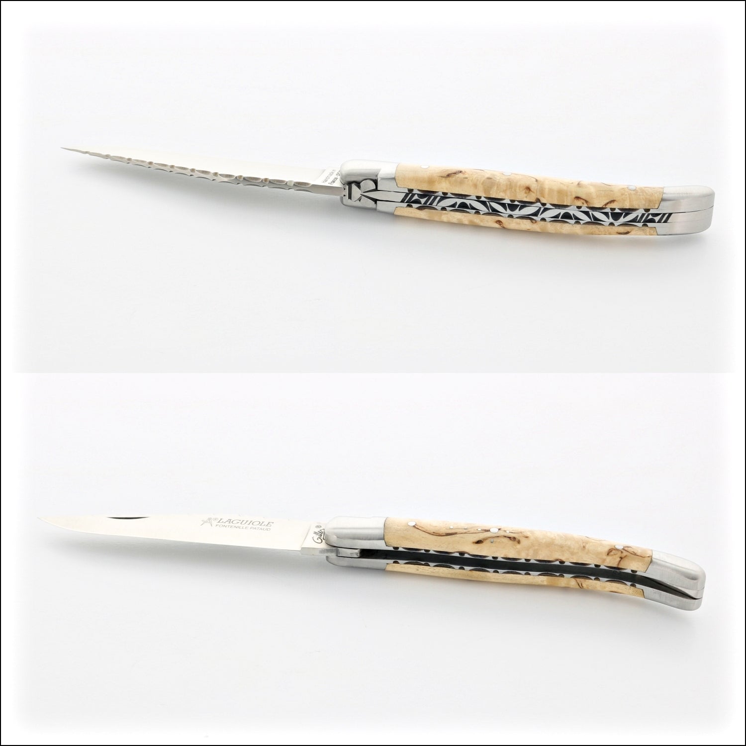 The file work on the springs (top of handle) are individually hand filled by a French artisan, therefore all are different. Additionally, two handles made from the same material can have very different patterns.