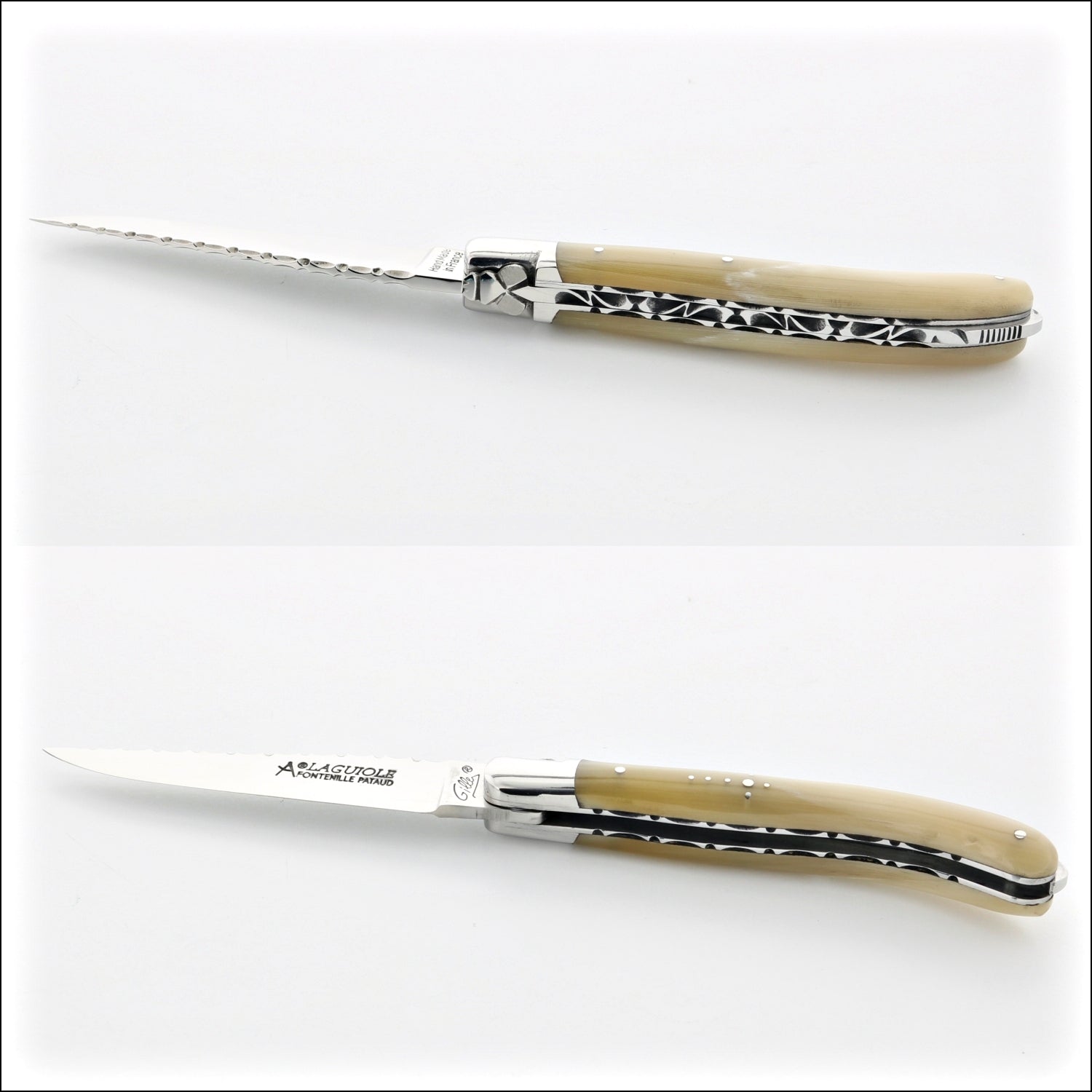 The file work on the springs (top of handle) are individually hand filled by a French artisan, therefore all are different. Additionally, two handles made from the same material can have very different patterns.