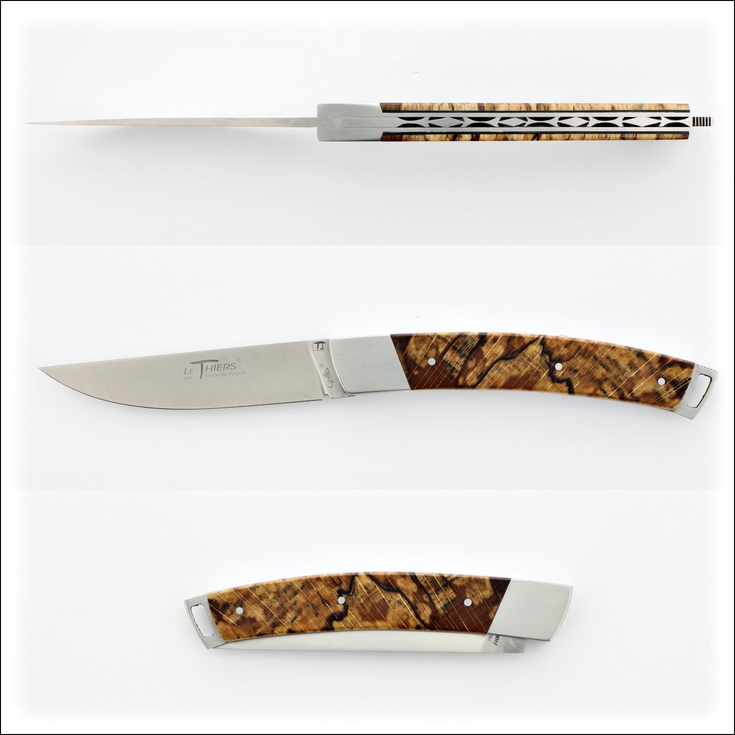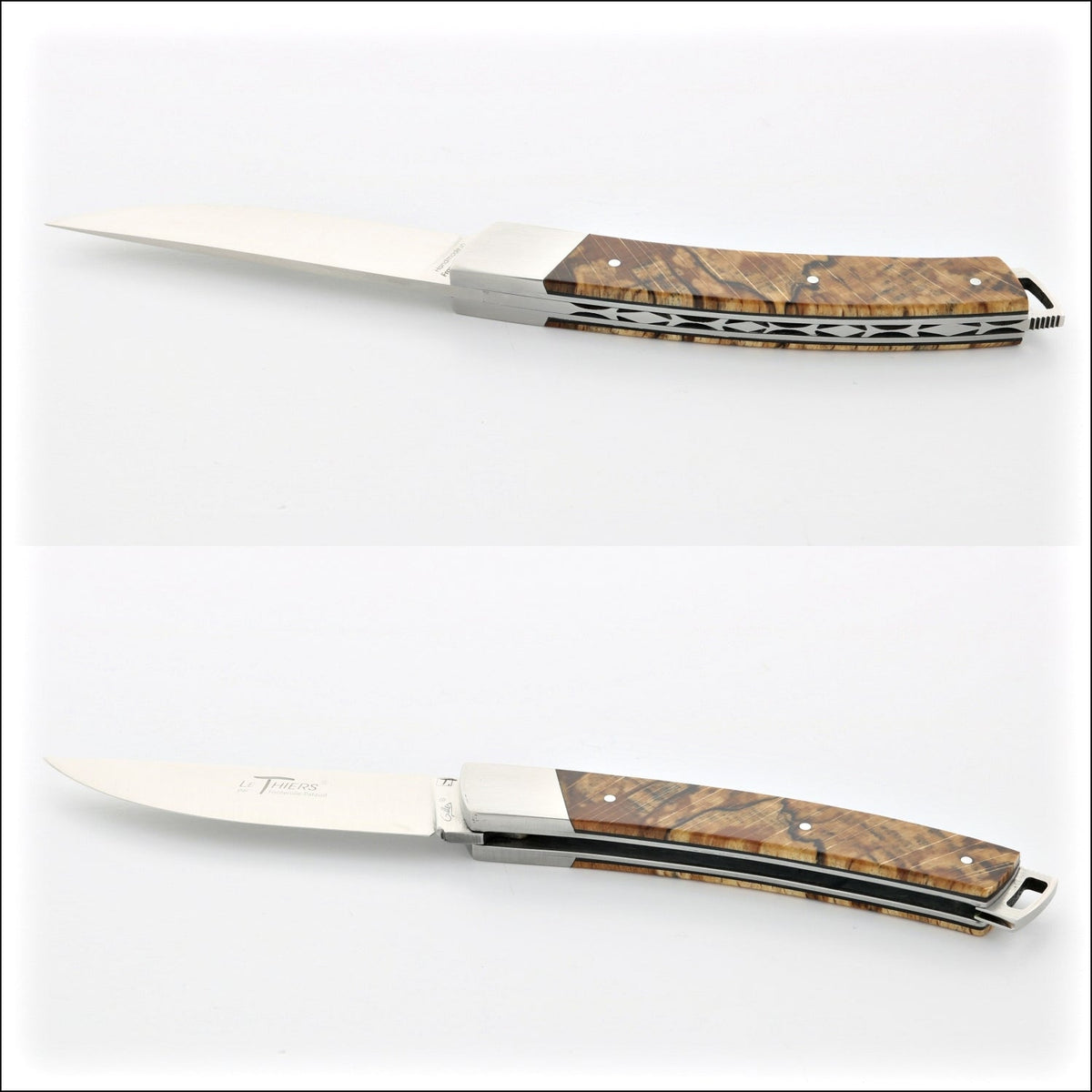 Handcrafted in Thiers-France, this knife was approved by the "Coute de Tie," the Guild which certifies the authenticity of the design. The name Le Thiers® Nature by Fontenille Pataud” is a tribute to the city of Thiers. Like Solingen in Germany or Sheffield in England, Thiers has, for several centuries, been the hub of the French knives and cutlery industry. Le Thiers® Nature by Fontenille Pataud offers a good balance between the blade and the handle thanks to its special forged spring. A groove into the back of the spring allows the blade to fold in.